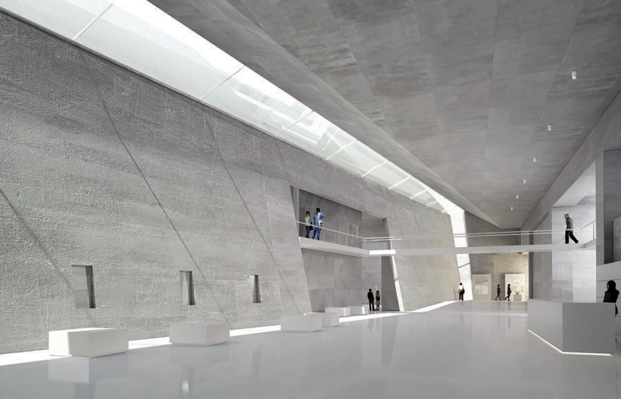 The museum, introverted and self-sufficient, is “bore in the womb” of the earth, constituting the new city level which converses explicitly with both the archaeological site and the “cultural shore”. The new level bends abruptly and is folded in a downward movement to the “bowels” of the composition. The two levels—that of the museum and that of the city—are brought together. Above the re-configured ground, the museum floats in the form of a pure prismatic mass conversing with the remaining reference points of Piraeus. The building is articulated along a basic compositional idea, which corresponds to the visitors route. The starting point is placed at the public square level with the path being plotted parallel to the slanted low lying wall. The latter penetrates the re-configured ground and modulates the composition. This gesture gives shape to the foyer and defines utilitarian spaces becoming thus a compositional “wedge” energizing the museum. The spiral route leading to the interior begins at the far end. The five thematic units foreseen by the museological study are arranged across this spiral path. The route ends at the core of the structure where the central stair links the museum to the city level.