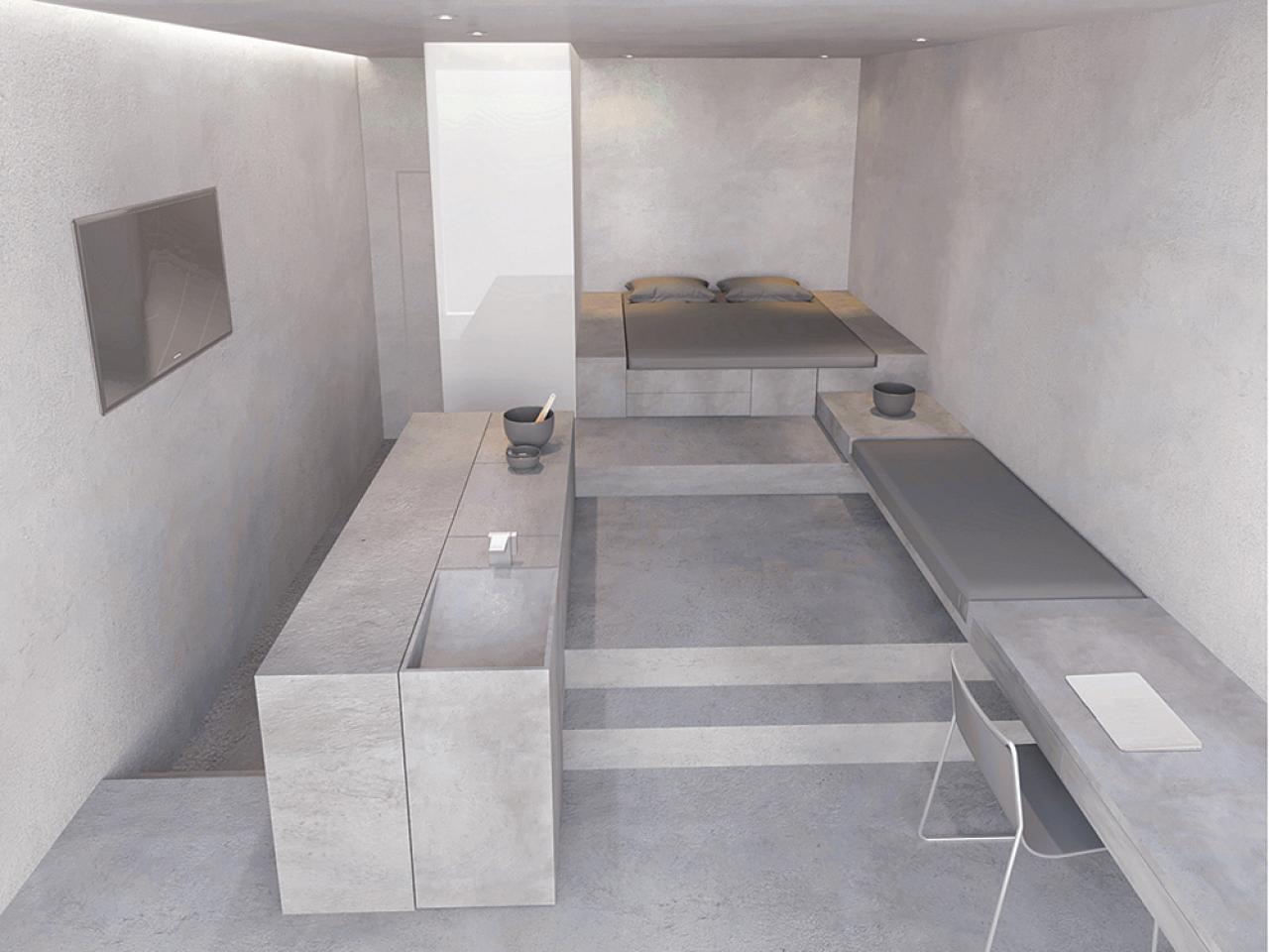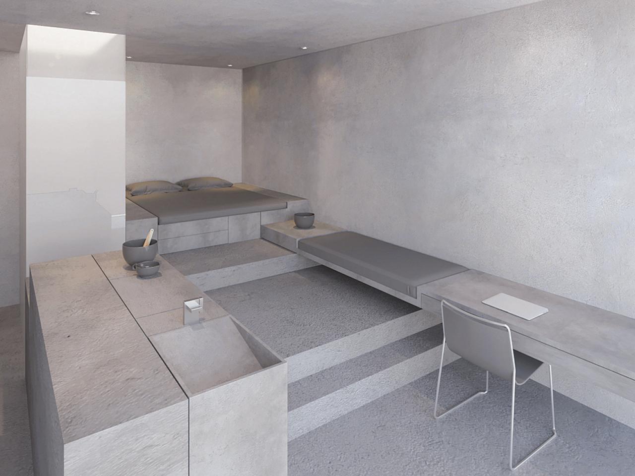 The composition consists of four functional units—distinct levels in section. The spiral route rising to the heart of the space, traverses and joins all levels together. The individual functional areas are made of units/masses that shape space and determine the flow of movement. Volume patterns are adjusted to the movement of ascending visitors, creating the impression of an ever-rising spiral.