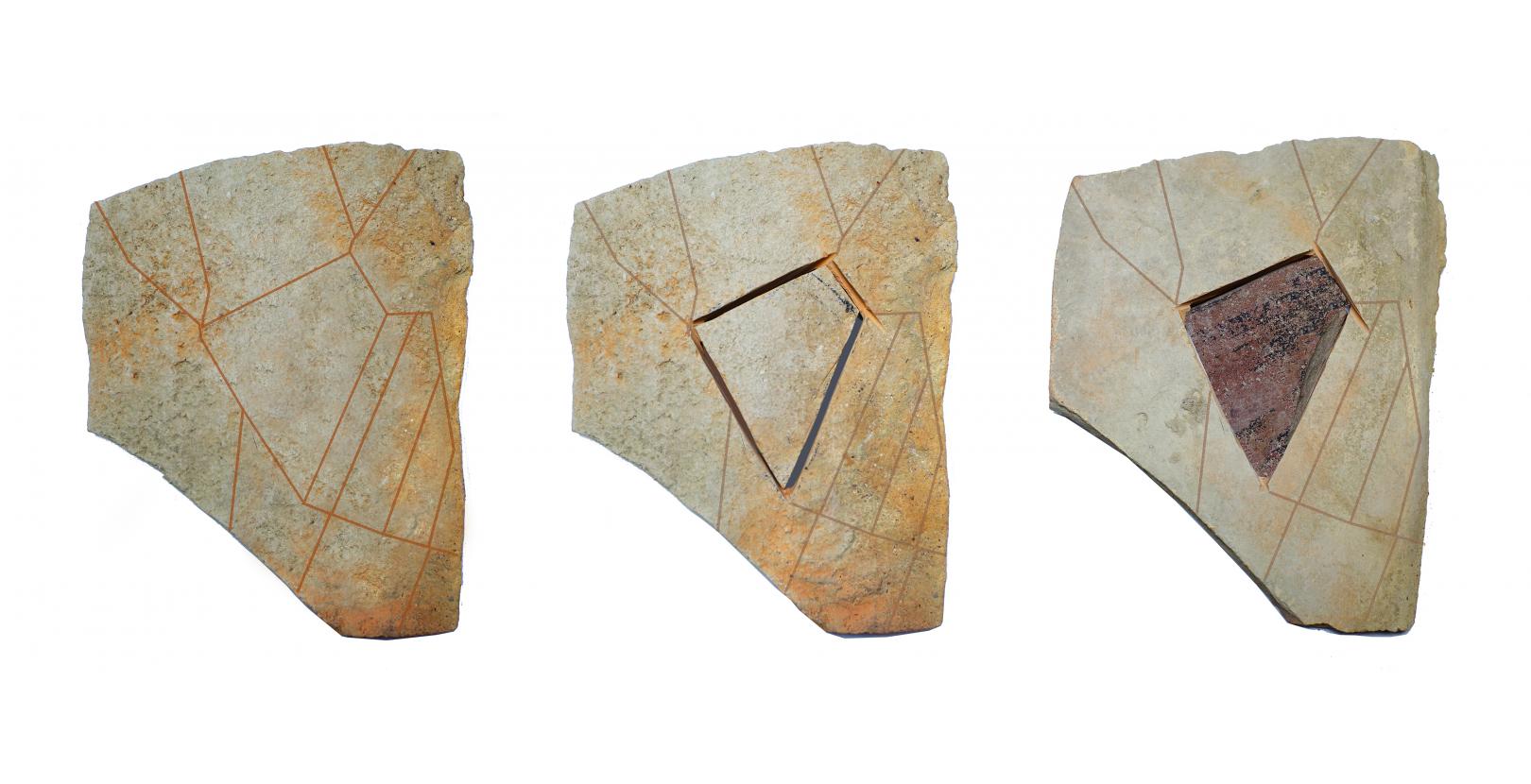 Αφορμή για την υλικότητα της παρέμβασης αποτελούν “θραύσματα αγγείων” που εντοπίζονται στο Αρχαιολογικό Μουσείο Θηβών και τα οποία συμβολίζουν το φάσμα του πολιτισμικού πλούτου της περιοχής. Οι πολλαπλές γαιώδεις αποχρώσεις, πορώδεις υφές και τονικότητες που διακρίνονται σε αυτά, αξιοποιούνται για να ερμηνευθεί το φαινόμενο του ρέματος στην επιδερμίδα του τόπου ώστε να είναι εμφανής τούτη η αναφορά.