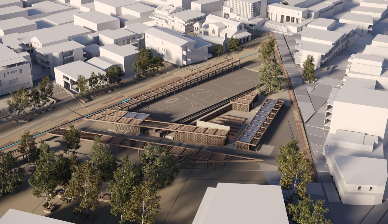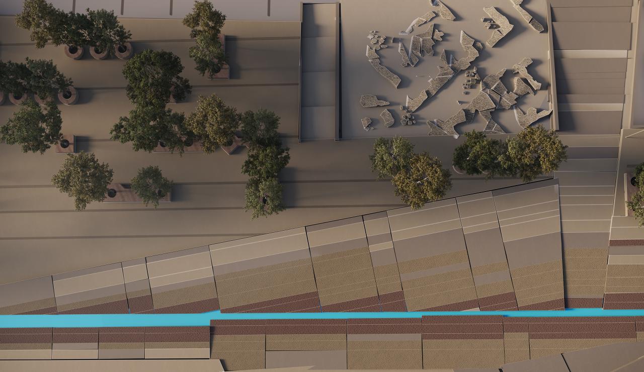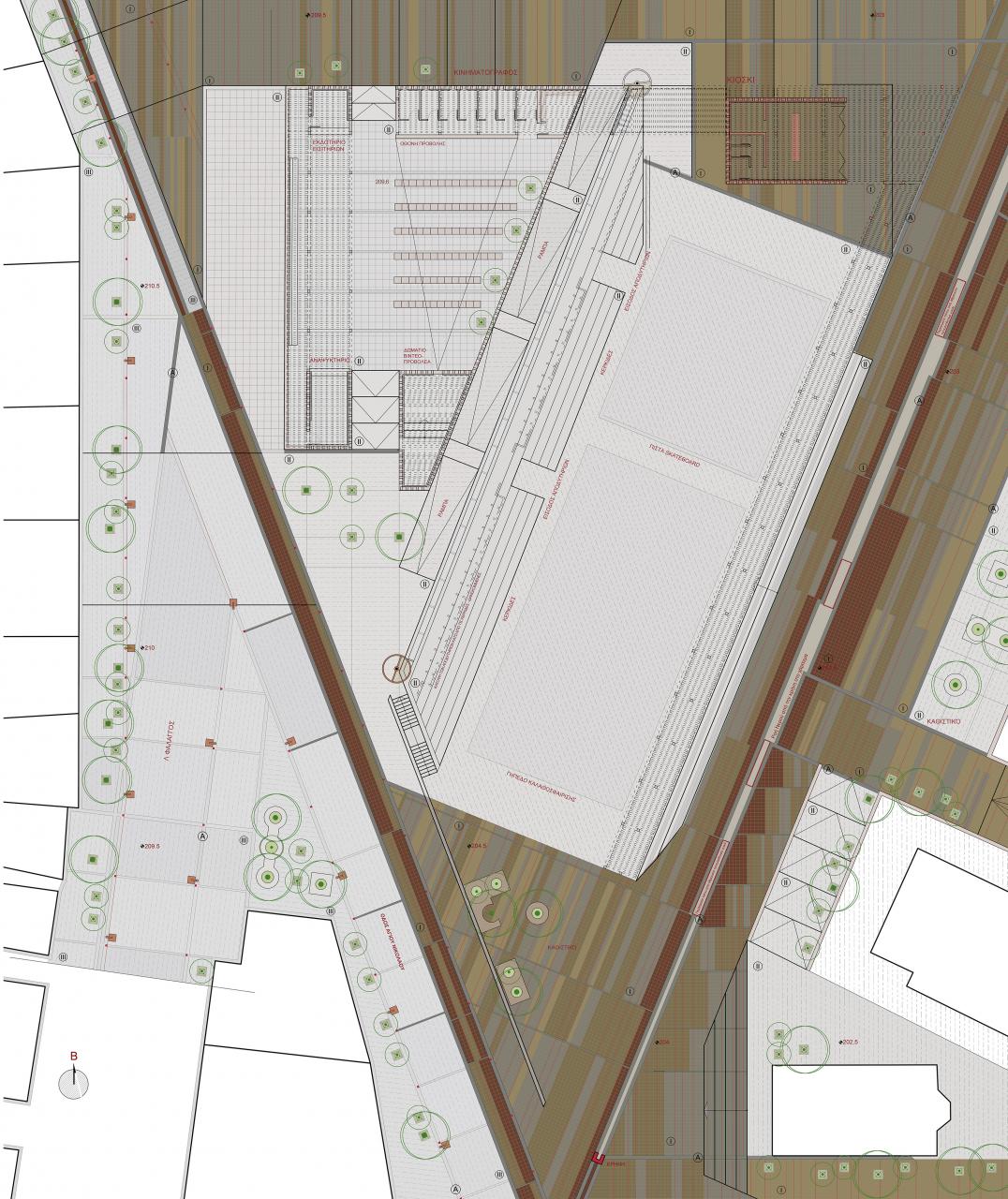 Το υφιστάμενο απότομο έδαφος αναδομείται σε λειτουργικά άνδηρα-πλατώματα που φιλοξενούν χρήσεις προτείνοντας μια τομή που διασφαλίζει στο σύνολο άμεση οπτική επαφή από και προς την περιοχή μελέτης, καθώς και απρόσκοπτη ομαλή προσπελασιμότητα. Ο νέος κοινός τόπος της πόλης συνδέεται οργανικά μέσω λειτουργικών προσβάσεων με το ιστορικό κέντρο Θηβών δημιουργώντας ένα δίκτυο πολιτιστικής διαδρομής που ενώνει τις Νότιες πύλες με το Βορινό άκρο της Καδμείας - Αρχαιολογικό Μουσείο. Ο χαρακτήρας του κοινού τόπου ενισχύεται αντιληπτικά μέσω της οπτικής-λειτουργικής ενοποίησης και με την ενιαία ύλη του.