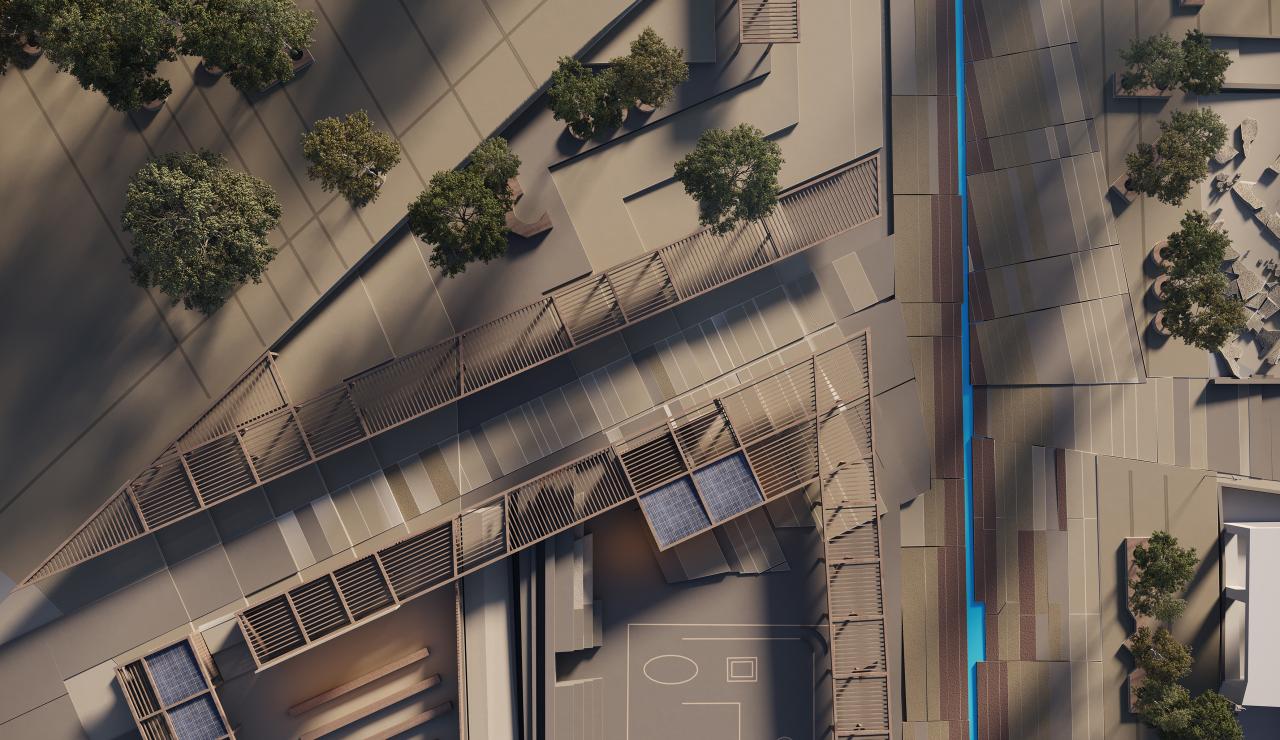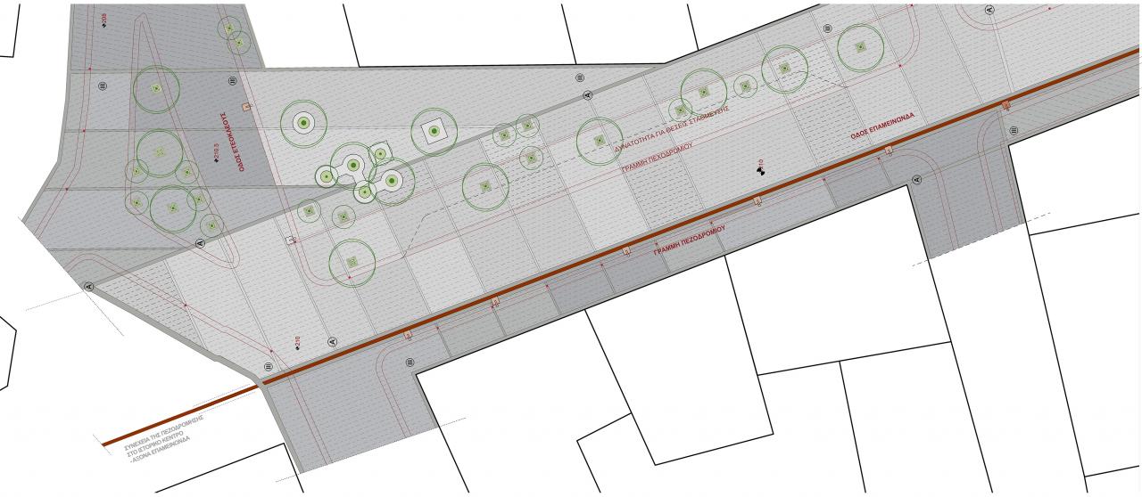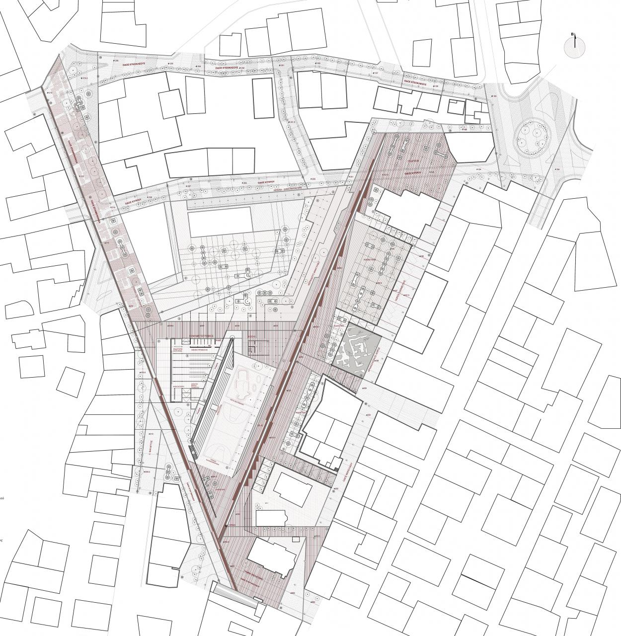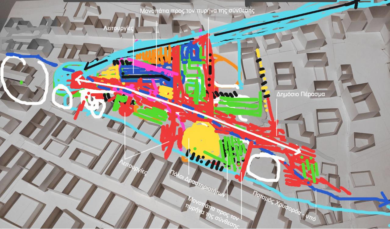 Δημιουργείται μια δημόσια διευρυμένη διαδρομή κεντρικά της περιοχής μελέτης που ωθεί τον περιπατητή στους εκατέρωθεν λειτουργικούς της πόλους και ενώνει, ως νήμα, χωρικά και λειτουργικά την παρέμβαση με την πόλη. Η σημειωμένη με κόκκινο οδός χαράσσεται στα χνάρια του ιστορικού ρέματος Χροσορρόα που διασχίζει την περιοχή μελέτης, αγκυρώνοντας τη σύνθεση στη “συλλογική μνήμη του τόπου”. Μέσα από τη μεταγραφή της Χρυσορρόα, της “ροής του νερού” στη “ροή του περιπατητή”, προκύπτουν χωρικά, δομικά και λειτουργικά χαρακτηριστικά με αναφορά στον ίδιο τον τόπο.