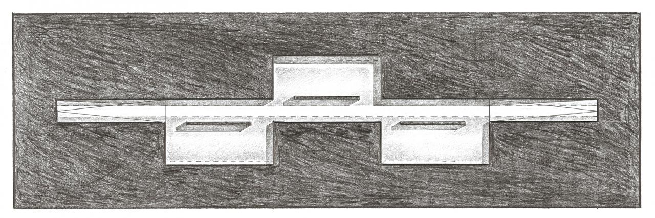 Η κεντρική χάραξη αναφέρεται σε μια ευθύγραμμη πορεία που συνδιαλέγεται με το επίπεδο του εδάφους. Το πέρασμα που δημιουργείται λειτουργεί ως νήμα που ενώνει χωρικά τους επιμέρους τόπους, τις επιμέρους συνθήκες.
