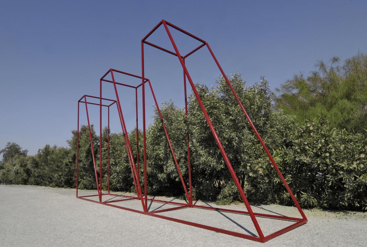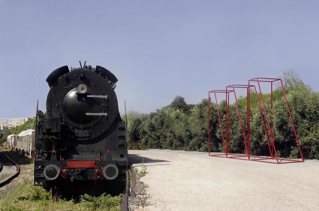 Προτείνεται μια κατασκευή, «ένα ιδεόγραμμα στο χώρο» που επιδιώκει να συλλάβει με τα ελάχιστα το συμβολισμό του τρένου, όπως πρωταρχικά στοιχειοθετείται στο νου. Πρόκειται για ένα μεταλλικό χωροδικτύωμα που αποτελείται από τρία όμοια στερεά που ορίζονται από τις ακμές τους. Η κεκλιμένη φόρμα των όγκων καθώς και το κόκκινο χρώμα τους, προσδίδουν ένταση στο έργο. Η κατασκευή τοποθετείται στον περιβάλλοντα χώρο τού τρένου ώστε συνειρμικά να παραπέμπει στην καταγωγή του.